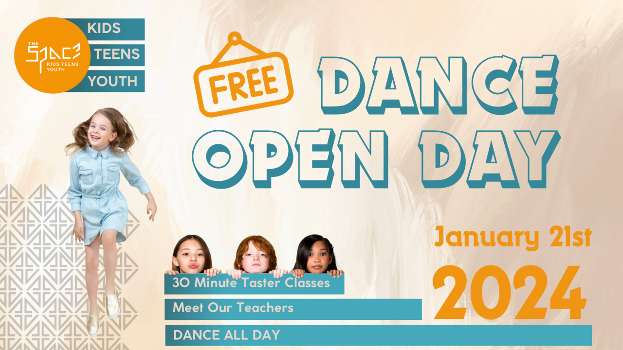 Come along to The Space for our Kids Teens Youth Open Day on Sunday 21st January, and try as many dance classes as you want FOR FREE! The 30 minute taster classes throughout the day will provide the perfect opportunity to experience the variety of different styles we have on offer for 2024.